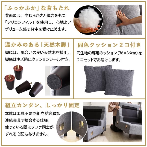 【構造部材】本体:木製フレーム 脚部:天然木(高さ8cm) 【張り材】ファブリック:ポリエステル 100% 合成皮革:塩化ビニル樹脂 【クッション材】Sバネ、ポケットコイル、ウレタン